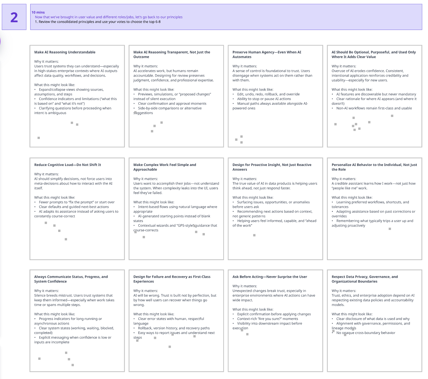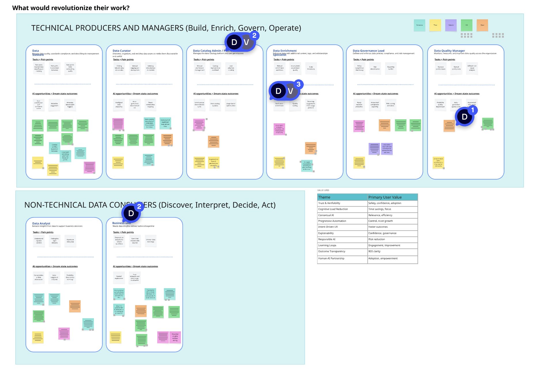 The team I joined was less than a year old, operating inside a newly formed Workflow Data Fabric department, with product managers still learning the data catalog space. The pace was fast and the expectations were high. Within the first 90 days, I established AI and design principles, restructured how the team operated, and started moving us from output-driven delivery toward work that connects to adoption and user value.