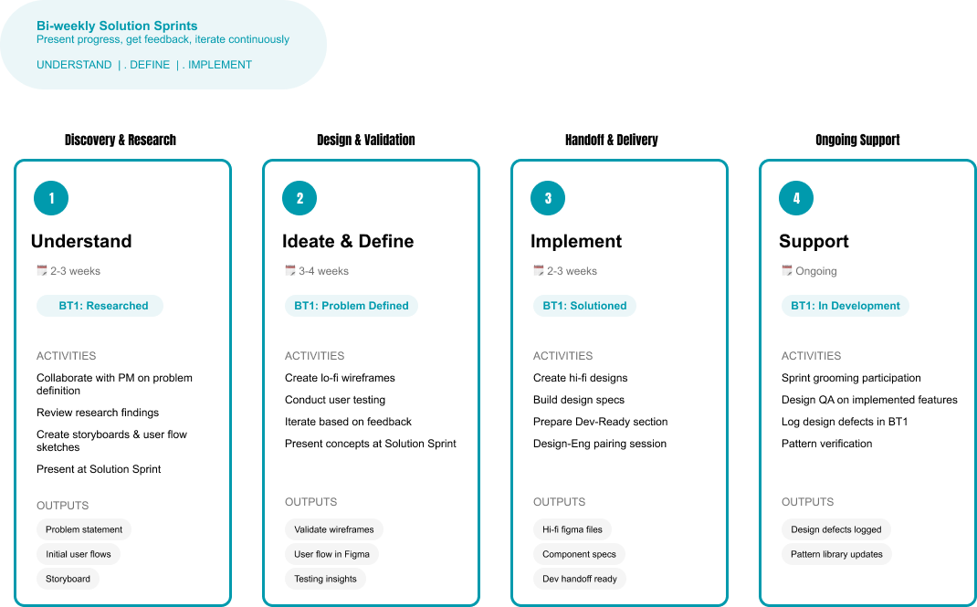 The department was running a slow, waterfall-adjacent delivery cycle with large family releases. I created artifacts and guidance to move to continuous planning and continuous delivery, helping design to navigate that shift.